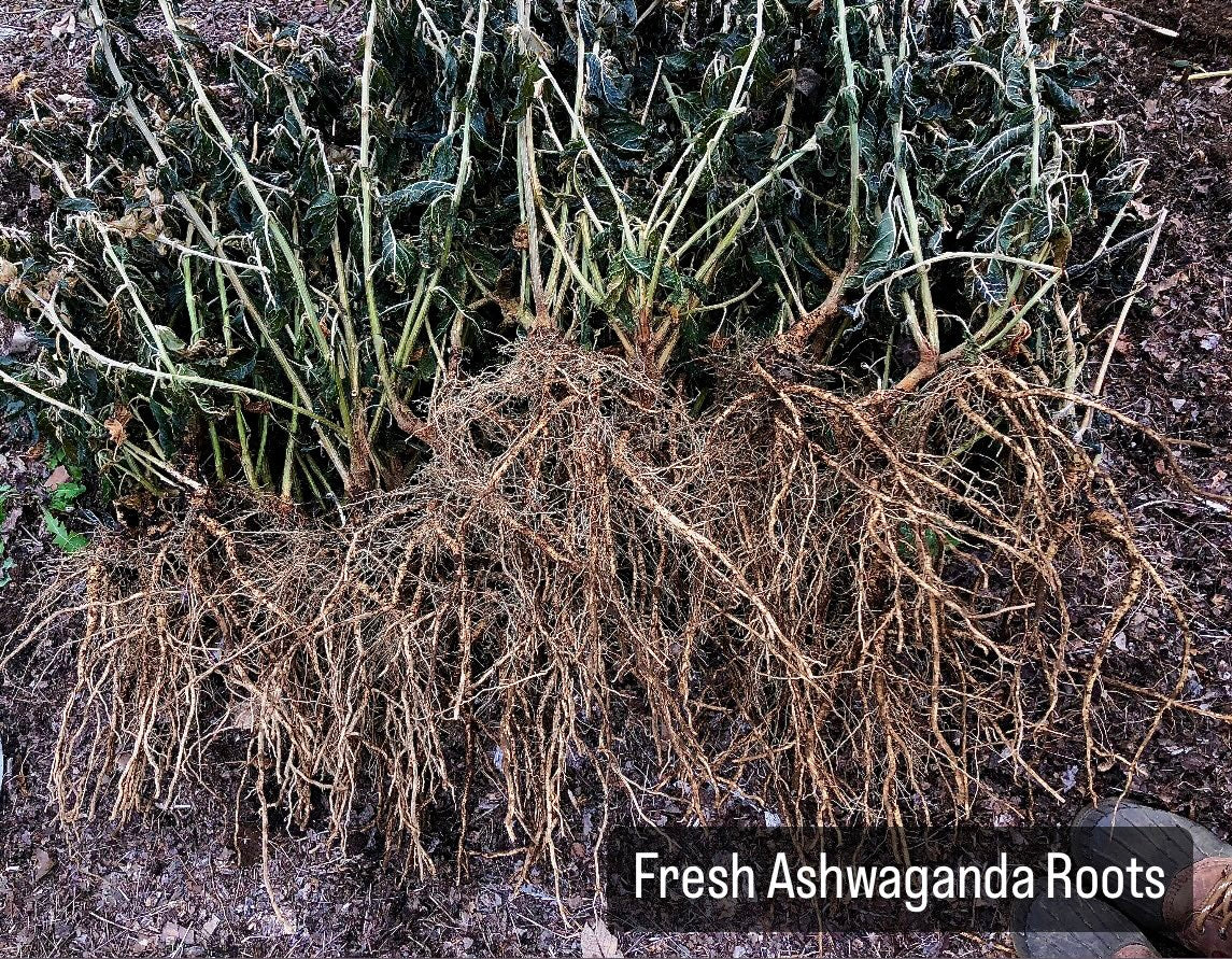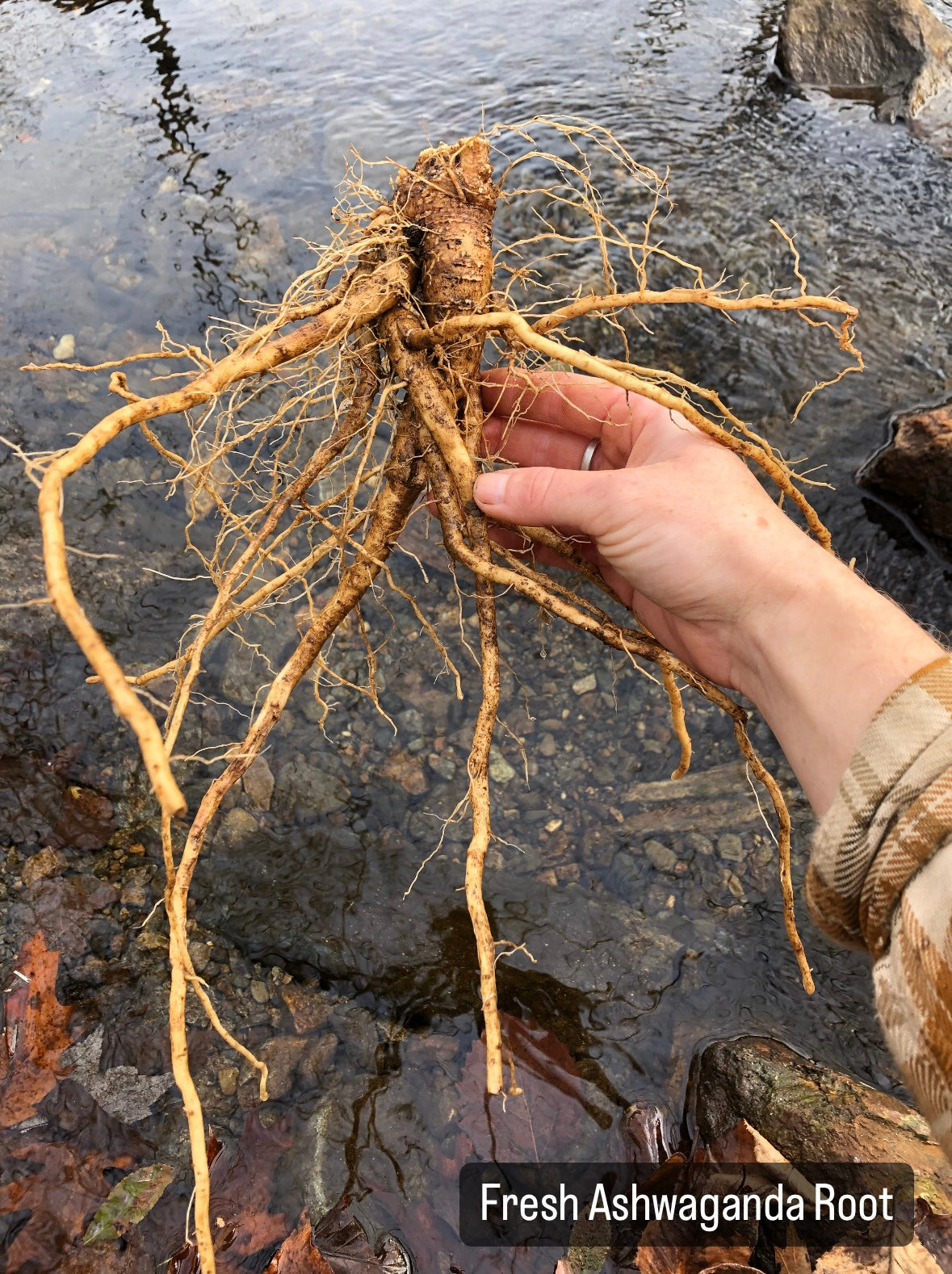 We tend our Ashwaganda from seed to harvest. In early spring, the seeds are sown warm and protected. The seedlings grow for several weeks and are moved into larger pots before being transplanted into the garden. Throughout the season, their green lobed leaves unfurl as the plants branch and stretch toward the sun. By late summer, prolific yellow flowers give way to tiny lantern-wrapped fruit which mature to an orange red and are packed with tiny seeds. We gather and process the seeds to begin again come spring.