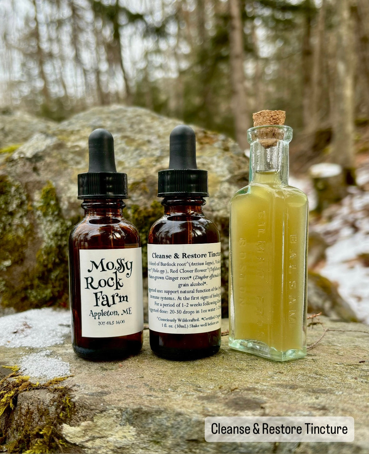1 fl oz (30mL) Tincture. A blend of Burdock root^(Arctium lappa), Violet leaf and flower^(Viola spp.), Red Clover flower^(Trifolium pratense), and Maine-grown Ginger root* (Zingiber officinale) infused in Maine distilled grain alcohol*. [ ^Consciously Wildcrafted. *Certified Organic.] This alcohol is naturally gluten free.