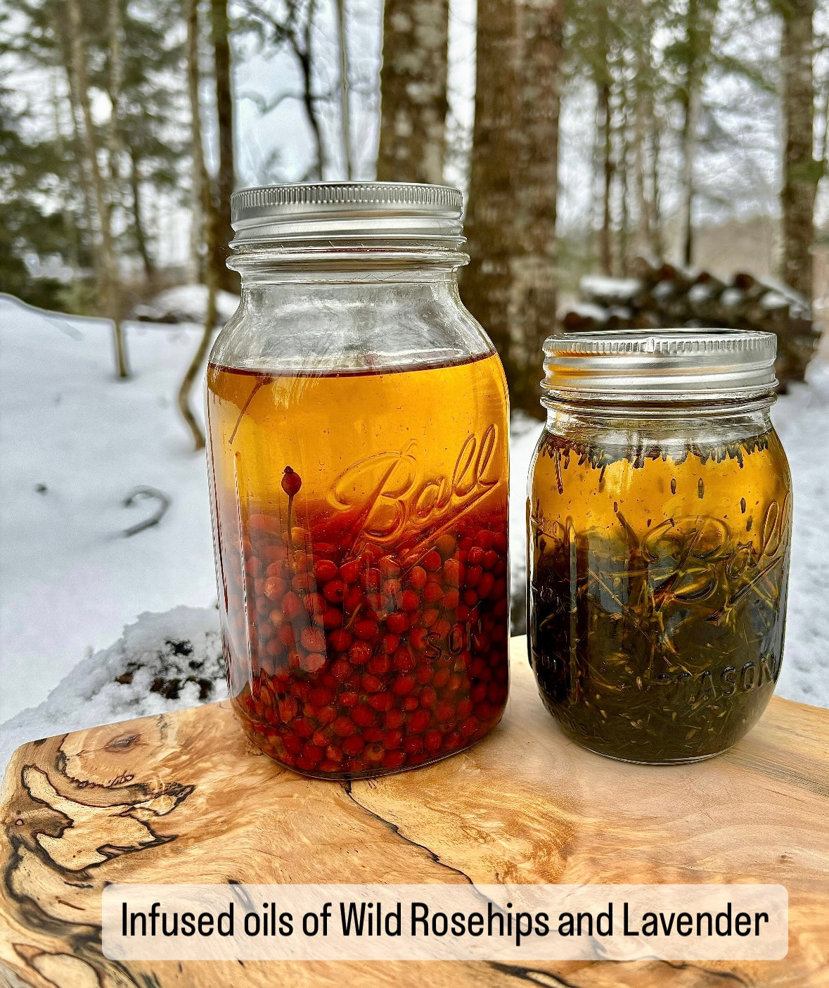 A toothy and tendrilled wild rose perfumes a shaded path over the ever-changing creek. Its slender fruits, red and brightening against the fading hues of autumn, now enrich handmade oil infusions.