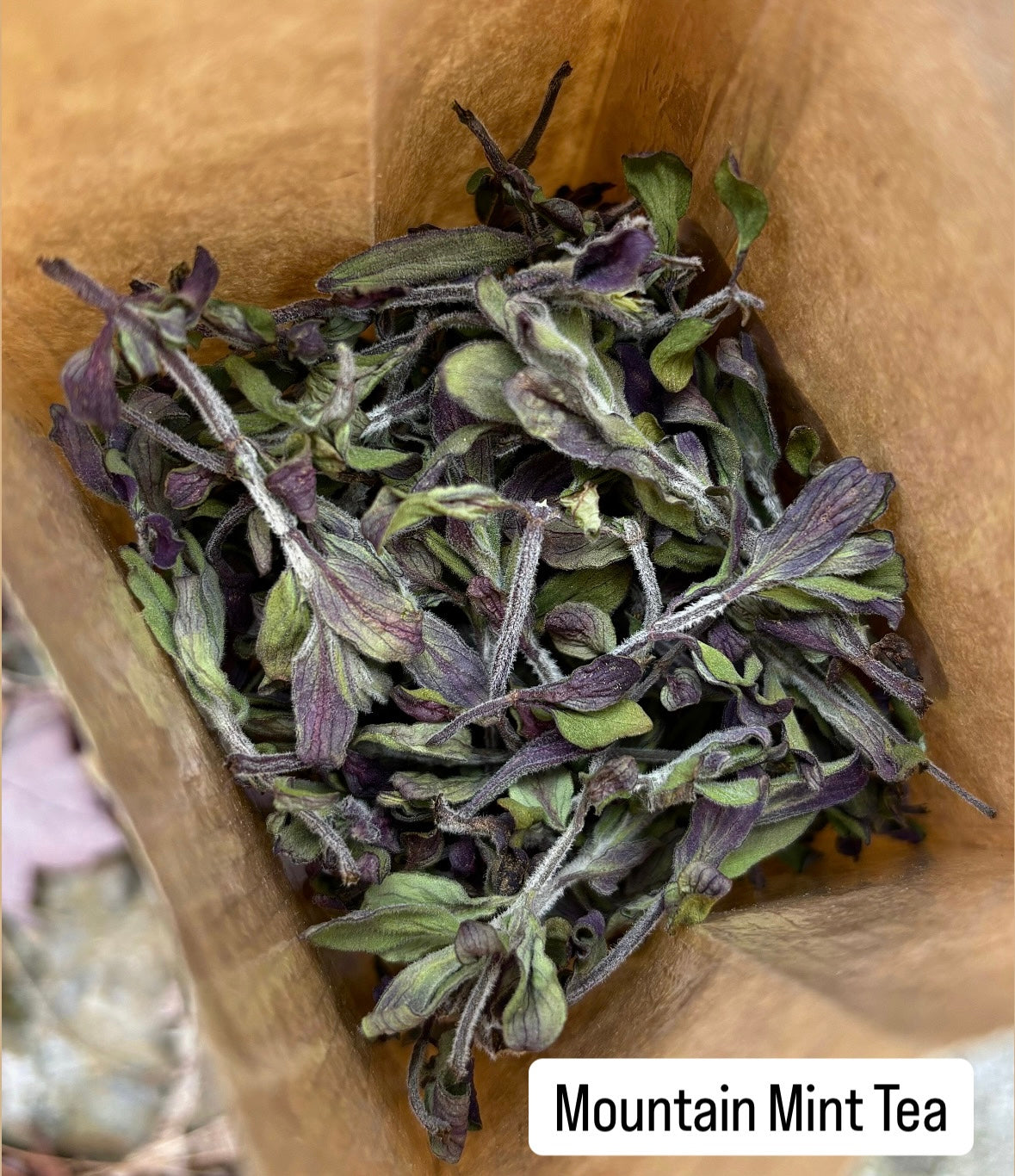 Our farm-grown whole leaf and tender tips of Mountain Mint. Deliciously aromatic, cooling and uplifting. Helps to clear congestion and settle the mind.