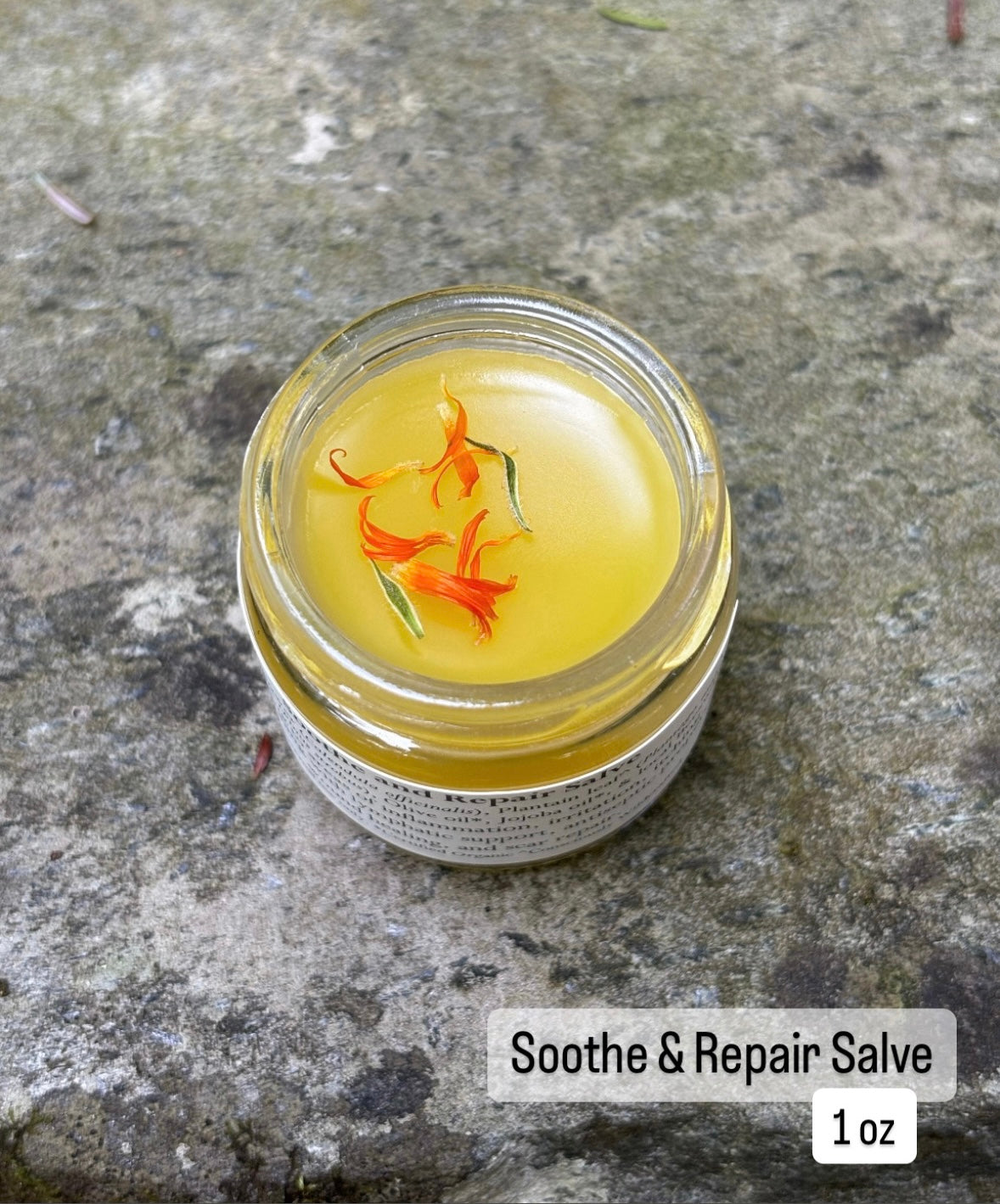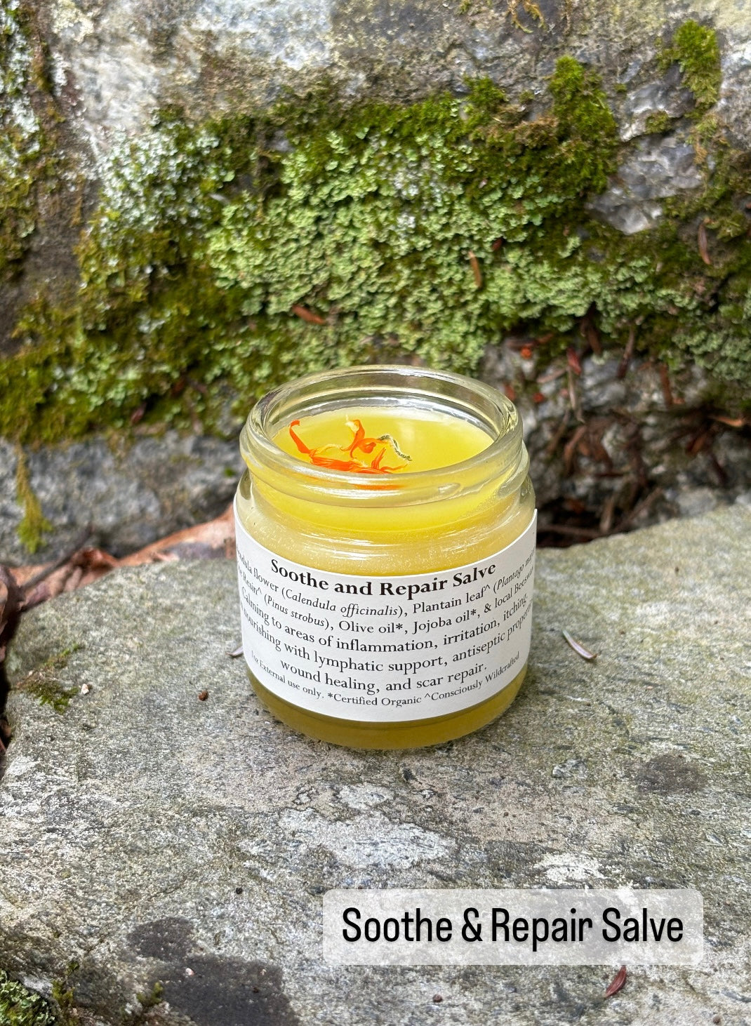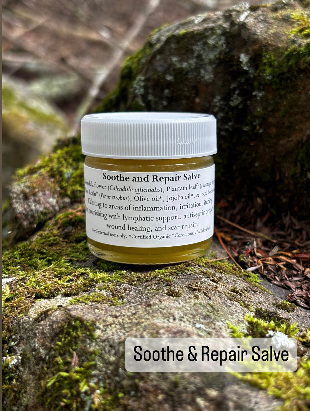 Calendula flower (Calendula officinalis), Plantain leaf^ (Plantago major), Self-heal flowers, Pine Resin^ (Pinus strobus), Jojoba oil*, & local Beeswax.