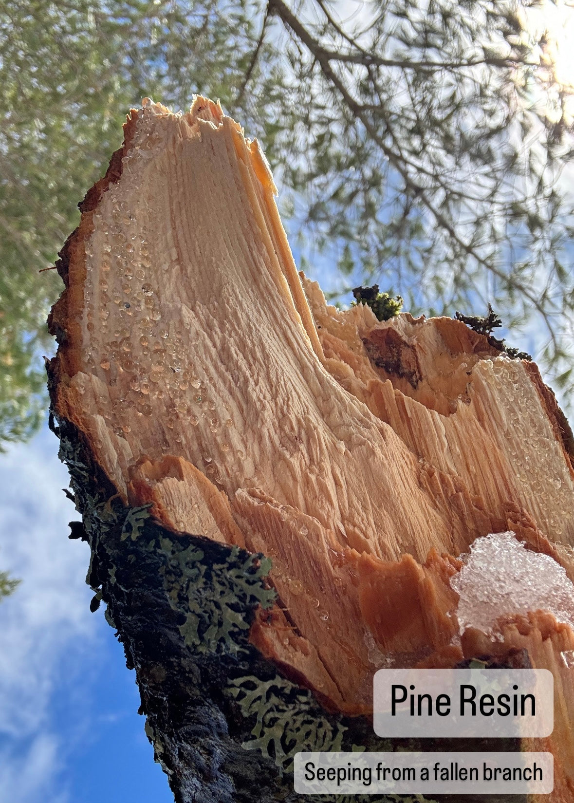 Wending our way through the woods, we hand-gather pine resin. Gently lifting the globules that have run down the outer bark of various pine trees. Exuded to heal a tree’s wound, we are careful not to leave the tree vulnerable, only removing resin that has formed droplets or a tiny rivulet below the source. We carefully warm, infuse and filter this resin to reveal its rich clear amber quality.